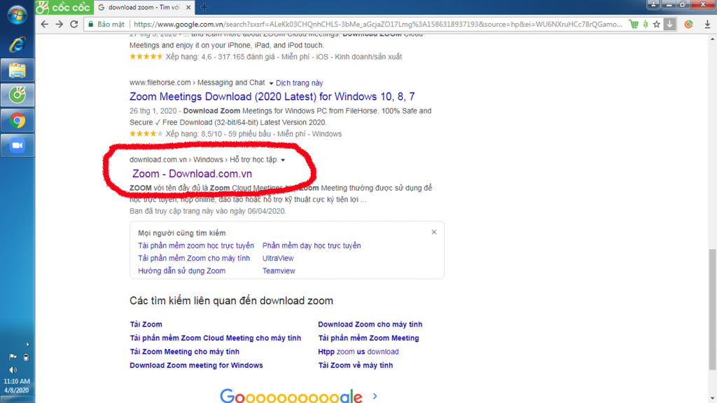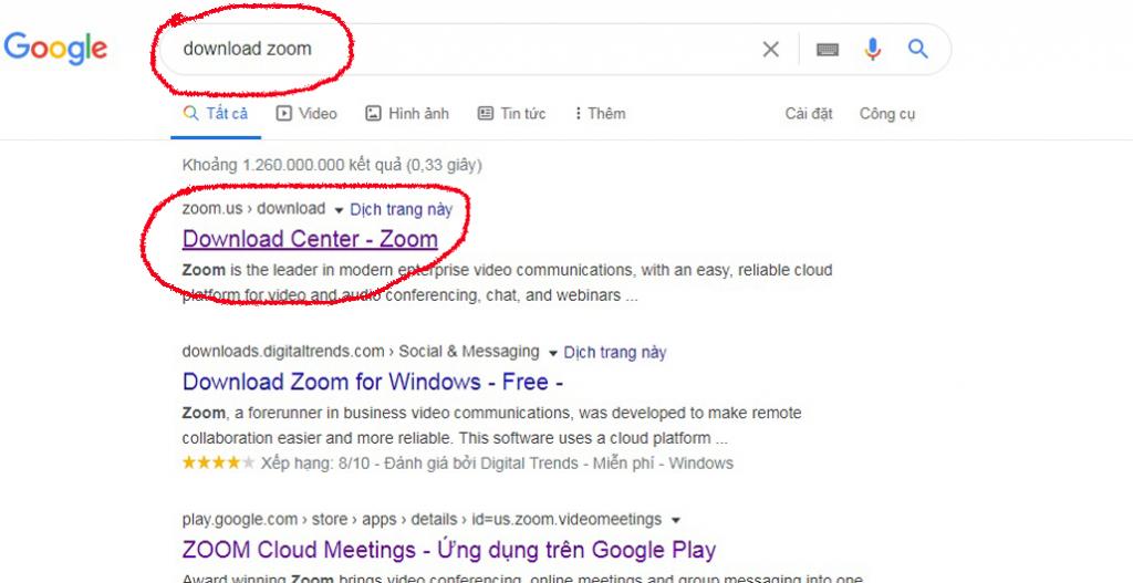 Bước 1: Mở trình duyệt Web, vào google.com.vn, tại mục tìm kiếm trên thanh công cụ google chúng ta gõ "download zoom" sau đó google sẽ hiển thị cho chúng ta kết quả tìm kiếm.