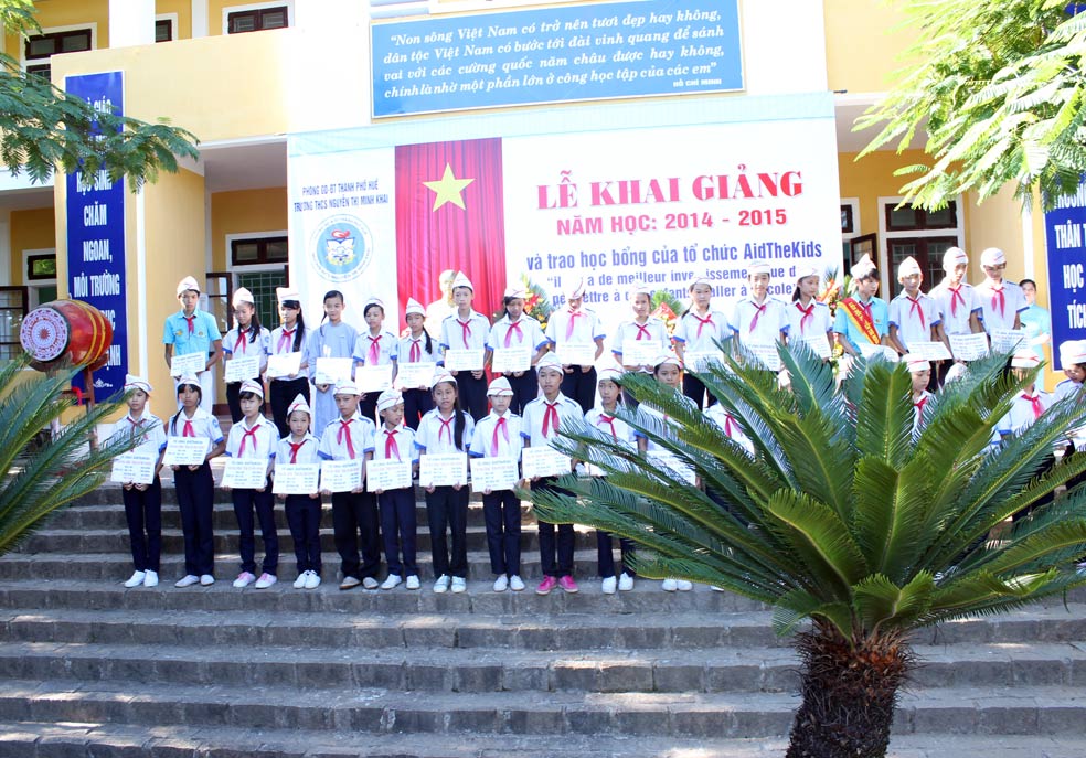 Cũng tại buổi lễ, ông Nguyễn Đắc Tuyến – Đại diện tổ chức AidTheKids đã trao 34 suất học bổng nhằm hỗ trợ cho các em học sinh có hoàn cảnh khó khăn nhưng luôn nỗ lực vươn lên, đạt thành tích tốt trong học tập. Đây là một hành động có ý nghĩa như lời động viên trước thềm năm học mới.