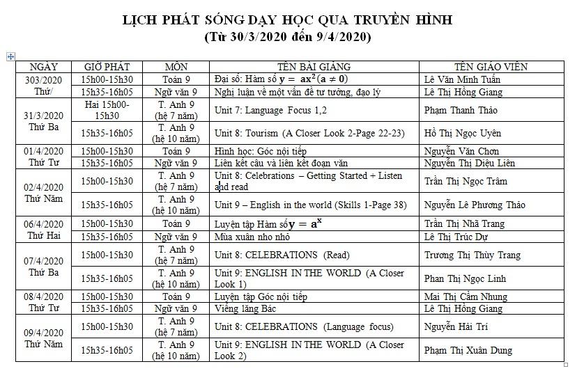 LỊCH PHÁT SÓNG DẠY HỌC QUA TRUYỀN HÌNH (Từ 30/3/2020 đến 9/4/2020)