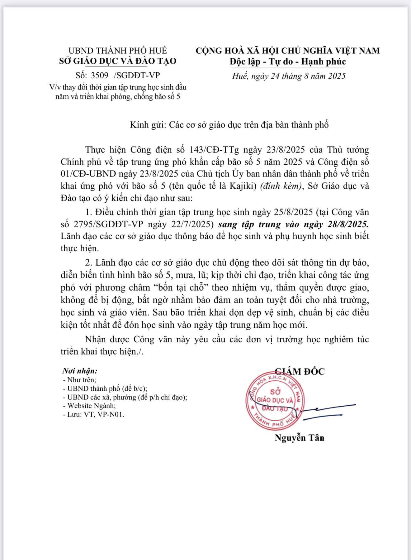 Thực hiện Công điện số 143/CĐ-TTg ngày 23/8/2025 của Thủ tướng Chính phủ về tập trung ứng phó khẩn cấp bão số 5 năm 2025 và Công điện số 01/CĐ-UBND ngày 23/8/2025 của Chủ tịch Ủy ban nhân dân thành phố về triển khai ứng phó với bão số 5 (tên quốc tế là Kajiki) (đính kèm), Sở Giáo dục và Đào tạo có ý kiến chỉ đạo như sau: