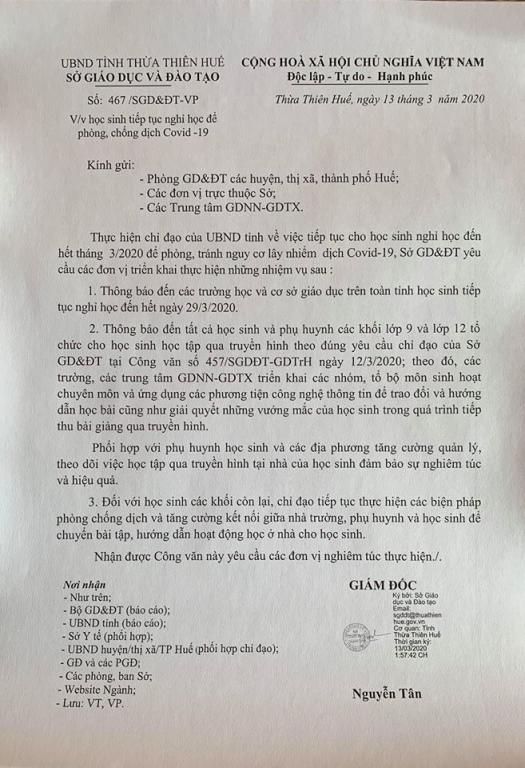 Thực hiện công văn 467/SGD&ĐT-VP ngày 13/03/2020 của Sở GD&ĐT; về việc tiếp tục cho học sinh nghỉ học để phòng chống dịch Covid-19.