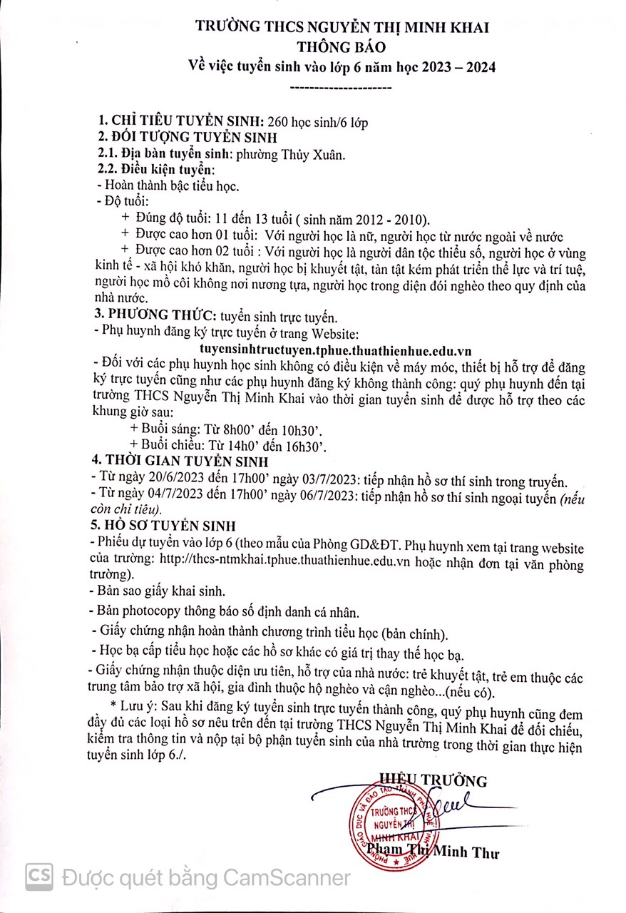 THÔNG BÁO TUYỂN SINH LỚP 6 NĂM HỌC 2023 - 2024