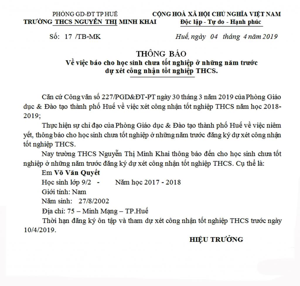 THÔNG BÁO Về việc báo cho học sinh chưa tốt nghiệp ở những năm trước dự xét công nhận tốt nghiệp THCS.