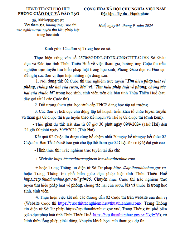 Tổ chức Cuộc thi trắc nghiệm trực tuyến “Tìm hiểu pháp luật về phòng, chống tác hại của rượu, bia” trong học sinh, sinh viên trên địa bàn tỉnh Thừa Thiên Huế
